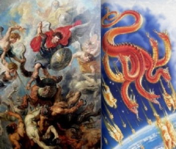 Off 12:7-8 Gökte savaş oldu. Mikail'le melekleri ejderhayla savaştılar. Ejderha kendi melekleriyle birlikte karşı koydu, ama gücü yetmedi. Bu yüzden gökteki yerlerini yitirdiler. 9 Büyük ejderha -İblis ya da Şeytan denen, bütün dünyayı saptıran o eski yılan- melekleriyle birlikte yeryüzüne atıldı.